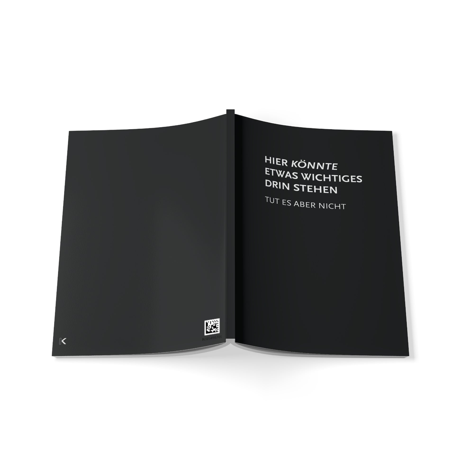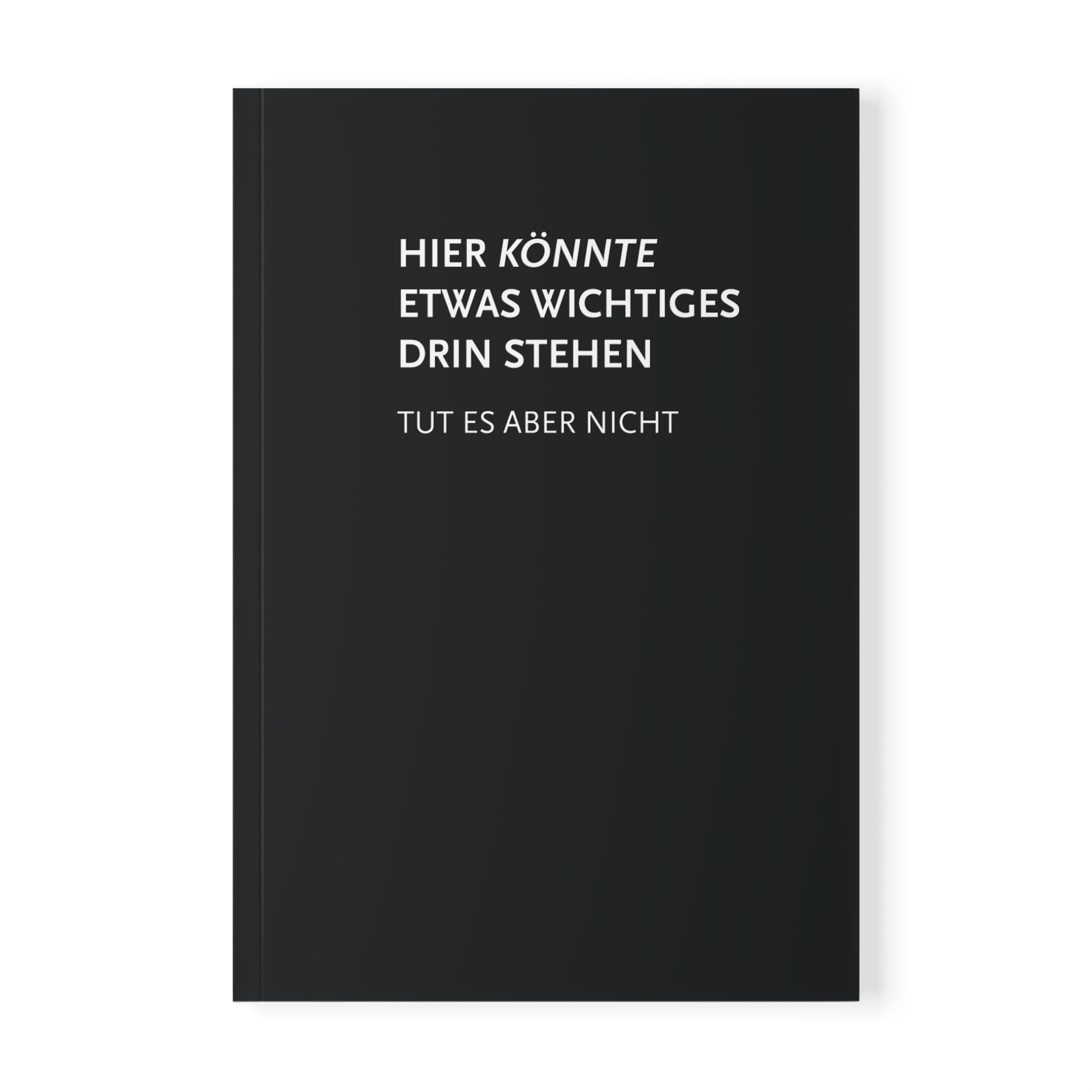 Notizbuch mit dem Spruch "Hier könnte etwas wichtiges drin stehen - tut es aber nicht"